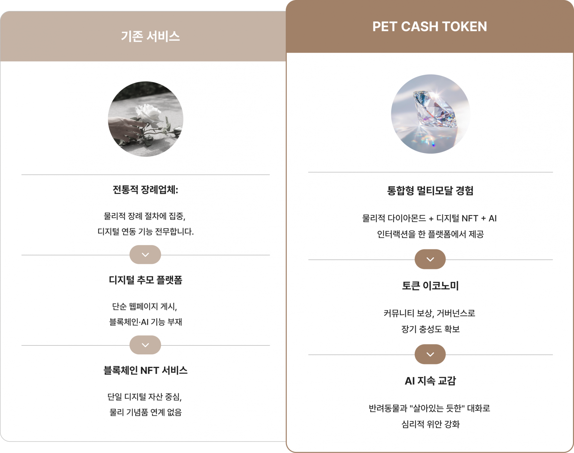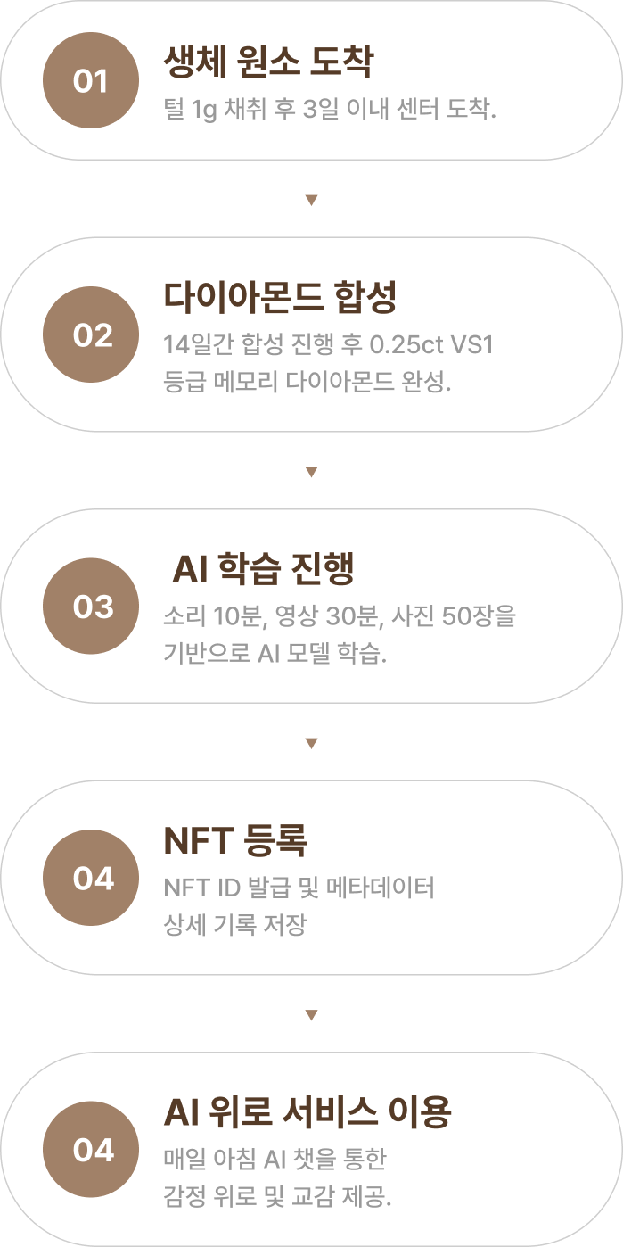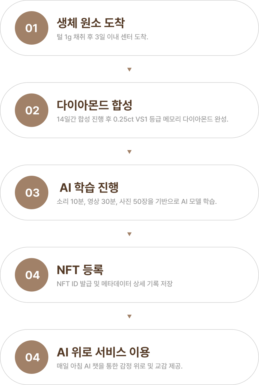 추모 다이아몬드, 디지털 NFT, AI 교감, 그리고 토큰 시스템까지 기억을 남기고 이어가는 모든 과정을 하나로 묶어 단순한 서비스가 아닌 ‘반려 메모리 생태계